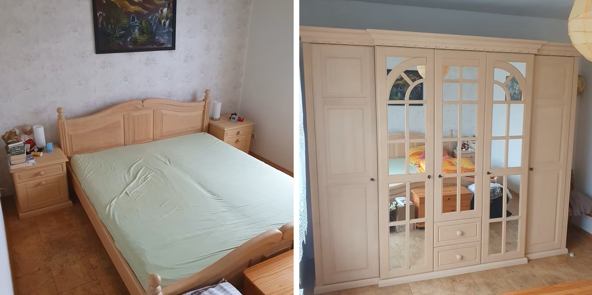 Masivní ložnice, opalovaný smrk, lůžko 180 x 200 cm (190 x 208 cm), šatní skříň š 226 x v 212 x h 56 cm, 2 x noční stolek š 48 x v 42 x h 36 cm.