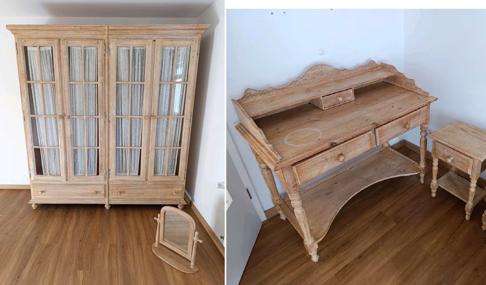 Masivní ložnice v romantickém stylu, bělený dub. Lůžko 160 x 200 cm, šatní skříň š 185 x v 195 cm (popř. lze rozdělit na dvě samostatné skříně), psací stůl š 107 cm, malé zrcadlo, 2 x noční stolek š 42 cm.