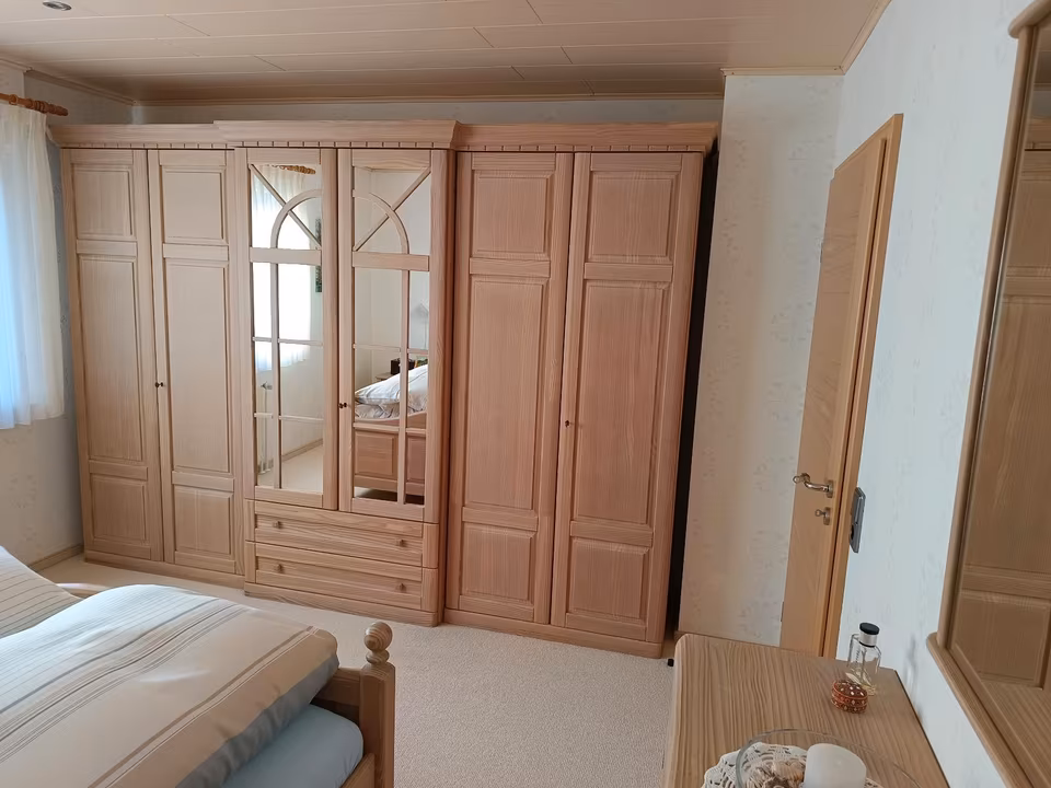 Masivní ložnice, lůžko 180 x 200 cm (vč. lamelových roštů 2 x 90 x 200 cm), šatní skříň š 260 x v 220 x h 63, 2 x noční stolek, zrcadlo.